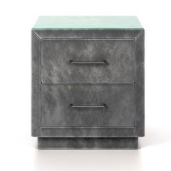 Прикроватная тумба с двумя выдвижными ящиками сочетается с любыми моделями кроватей, органично вписывается в интерьер практически любого стиля. Каркас тумбы выполнен из ДСП. Каркас тумбы и фасад ящиков покрыты обивочным материалом. Для удобства использования и продления срока эксплуатации, рекомендуется использовать стеклянную накладку. Накладка используется в качестве столешницы для тумбы и защищает ее от повреждений и загрязнений
