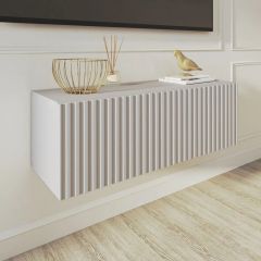 Благодаря своей компактности тумба под ТВ подвесная поможет сэкономить пространство, избежать ощущения загромождённости гостиной, спальни или детской комнаты, а рифлёный фасад будет акцентировать