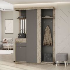 Прихожая "Лорейн" выполнена в современном стиле: правильные геометрические формы, сочетание модных цветов и печатный рисунок на фасаде. Прихожая имеет универсальную сборку, оснащена штангой и крючками для одежды, дверью-купе и зеркалом.
