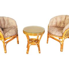 Комплект из натурального ротанга, состоящий из двух кресел и круглого столика с плетеной столешницей. Стекло входит в комплект.