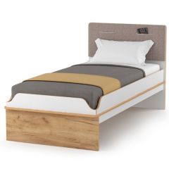 Кровать молодёжная Вуди 11.01. Цвет - белый премиум/дуб крафт золотой. Размер (ШхГхВ) 208х98х116 см. Спальное место 900х2000 мм. Основание под матрас (ЛДПС) в комплекте, матрас приобретается отдельно. Мягкое изголовье кровати изготовлено из практичной, модной ткани - рогожка и декорировано удобными карманчиками для аксессуаров.