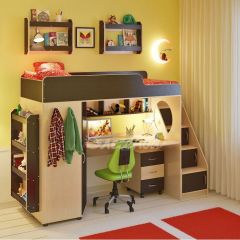 Под спальным местом находится учебная зона с письменным столом. Над столом располагается трёхсекционная встроенная полка, в которой удобно хранить книги, учебники, тетради, канцелярию и другие нужные вещи. Небольшая компактная тумба с тремя ящиками идеально дополняет мебельный комплект. Колёса позволяют без труда передвигать тумбу.