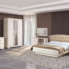 «кремовый белый», который уже успел полюбиться клиентам фабрики по серии «Марлен», но отличается более современным дизайном. В нем отсутствуют замысловатые декоративные элементы и колонны, на первый план выходят прямые линии. Украшением комплекта служат оригинальные итальянские ручки золотистого цвета. В оформлении фасадов комода сделан необычный ход. Некоторые линии, делящие ящики на, казалось бы, самостоятельные отсеки, на самом деле являются фрезеровкой. Кровать оснащена мягким тканевым изголовьем, что является сейчас безусловным трендом.