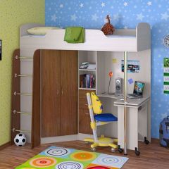 Кровать-чердак "Теремок-1" - это целый комплекс мебели, включающий в себя спальное место размером 190*80 см, шкаф для одежды, пенал с ящиками и полноценный рабочий стол. Прочная конструкция рассчитана на детей от 3 до 16 лет. Такой уголок экономит пространство в детской комнате, при этом обеспечивая все необходимые функции.
