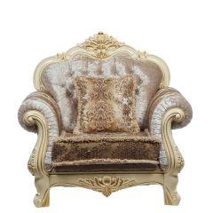 Красивое название для красивого кресла. Акцент сделан на богатый резной декор каркаса молочного цвета. Его цветочные мотивы изящно сочетаются с рисунком сидения. Два варианта исполнения ткани: бежевое золото или бирюза.